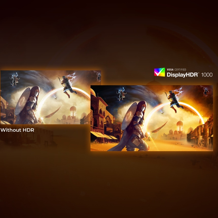 DisplayHDR 1000 VESA-approved offers a radically different visual experience. Unlike other "HDR-compatible" screens, true DisplayHDR 1000 delivers stunning brightness, contrast, and colors. Thanks to local dimming and extreme peak brightness reaching up to 1000 nits, images come to life with advanced light details and deeper, more nuanced blacks. It showcases a broader spectrum of rich new colors, providing a visual experience that fully engages your senses.
