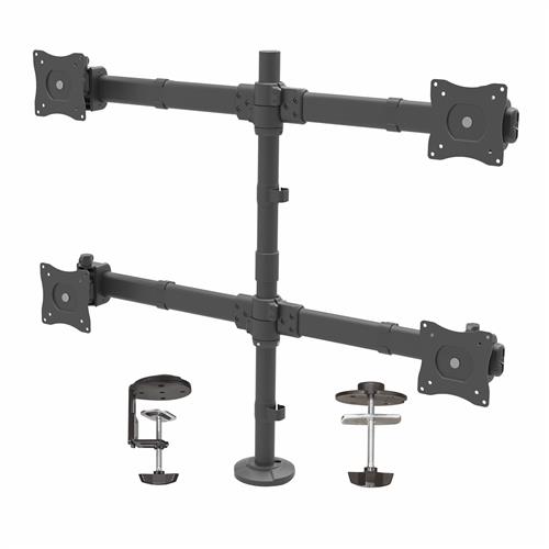 Questa soluzione consente di montare quattro monitor su un unico supporto, in modo che risultino sospesi sopra la superficie della scrivania, della workstation o del piano di lavoro, per liberare spazio prezioso. La staffa per il montaggio da scrivania, realizzata in robusto acciaio e pensata per i carichi pesanti, è in grado di mantenere in posizione quattro display e sorreggerli in tutta sicurezza, dando vita a uno spazio di lavoro efficiente e produttivo.